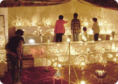 『あかりセラピー館』とは、簡単に表現すると陶器のランプシェードを、数多く展示し順路で巡って頂くランプの館の事です。陶器のランプシェードとは、布・紙・竹・木といった色々な素材で作ったランプシェードは国内外に多く存在しますが、そのランプシェードの中で、陶器の材料で作った器に穴を開けたり、カットしたりしたデザインの器の傘を、光源であるランプにかぶせ、彫り込んだ綺麗な図柄を光で浮かび上がらせたり、壁に映したりして楽しむものです。
